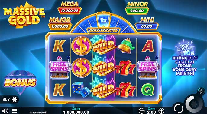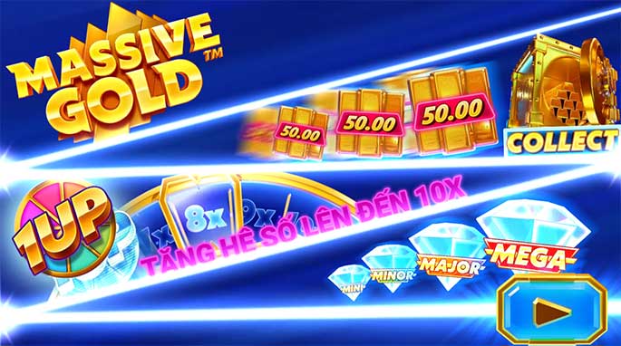 Tham gia “Vàng Khổng Lồ”, các trải nghiệm như điện giật, hoặc tính năng như Collect Wins, Gold Booster, Bonus, Free Spins và Buy đều rất mới mẻ.